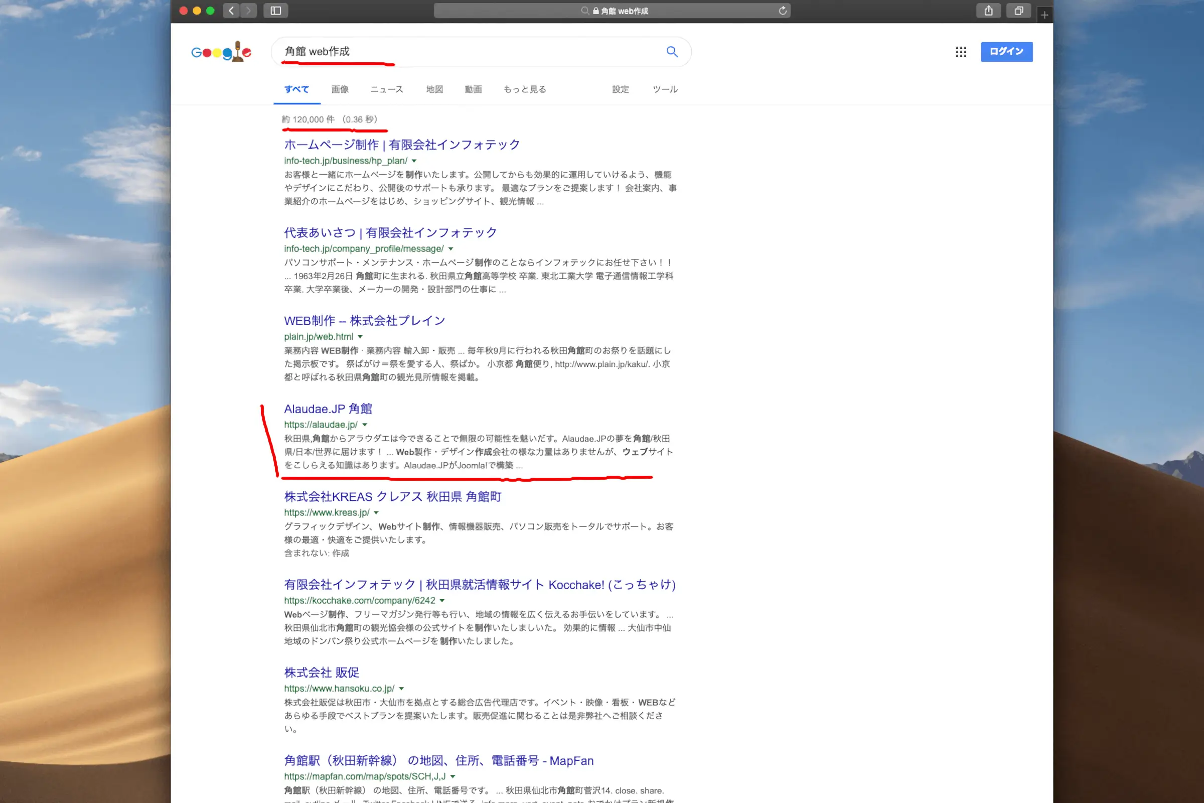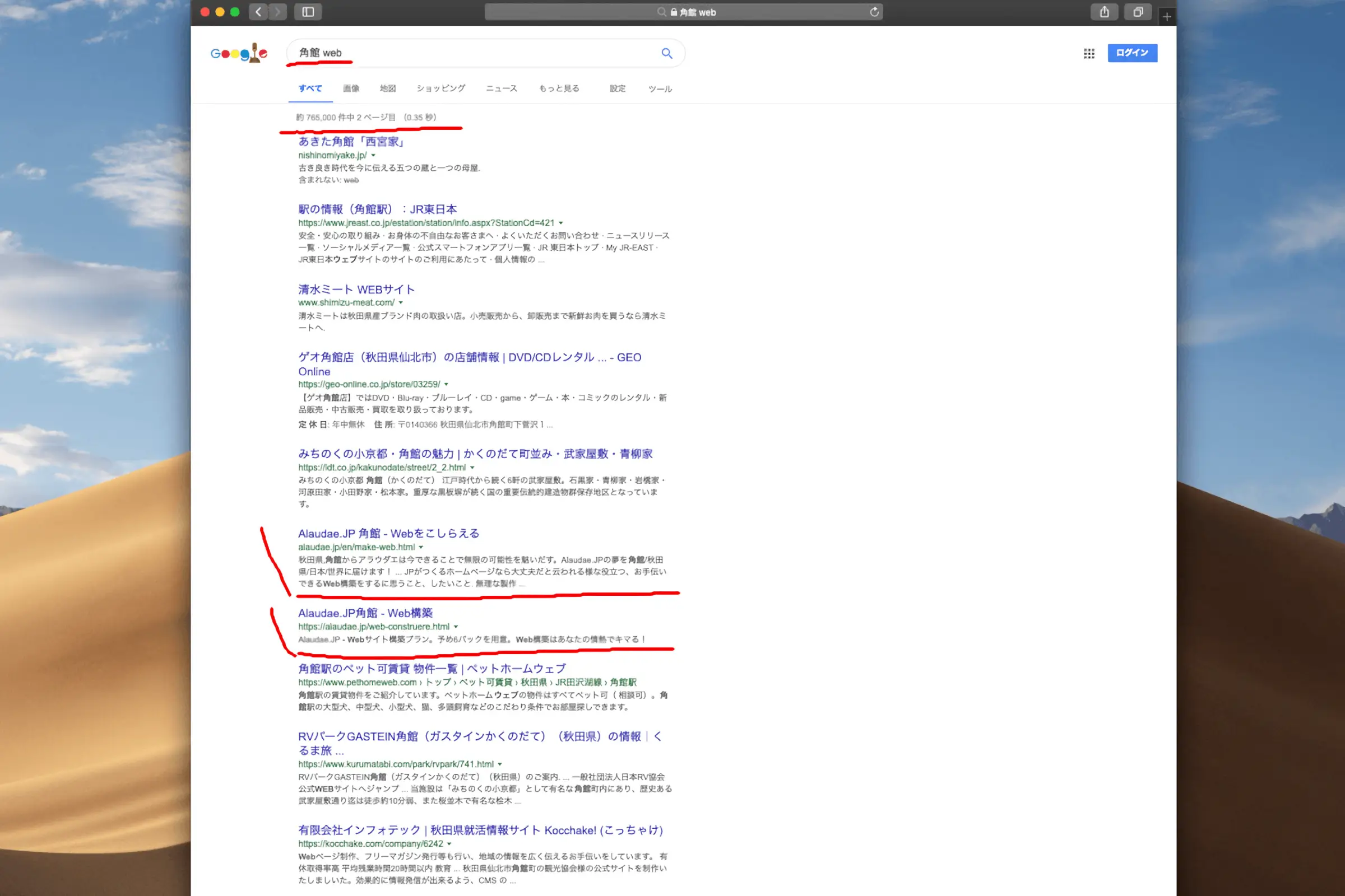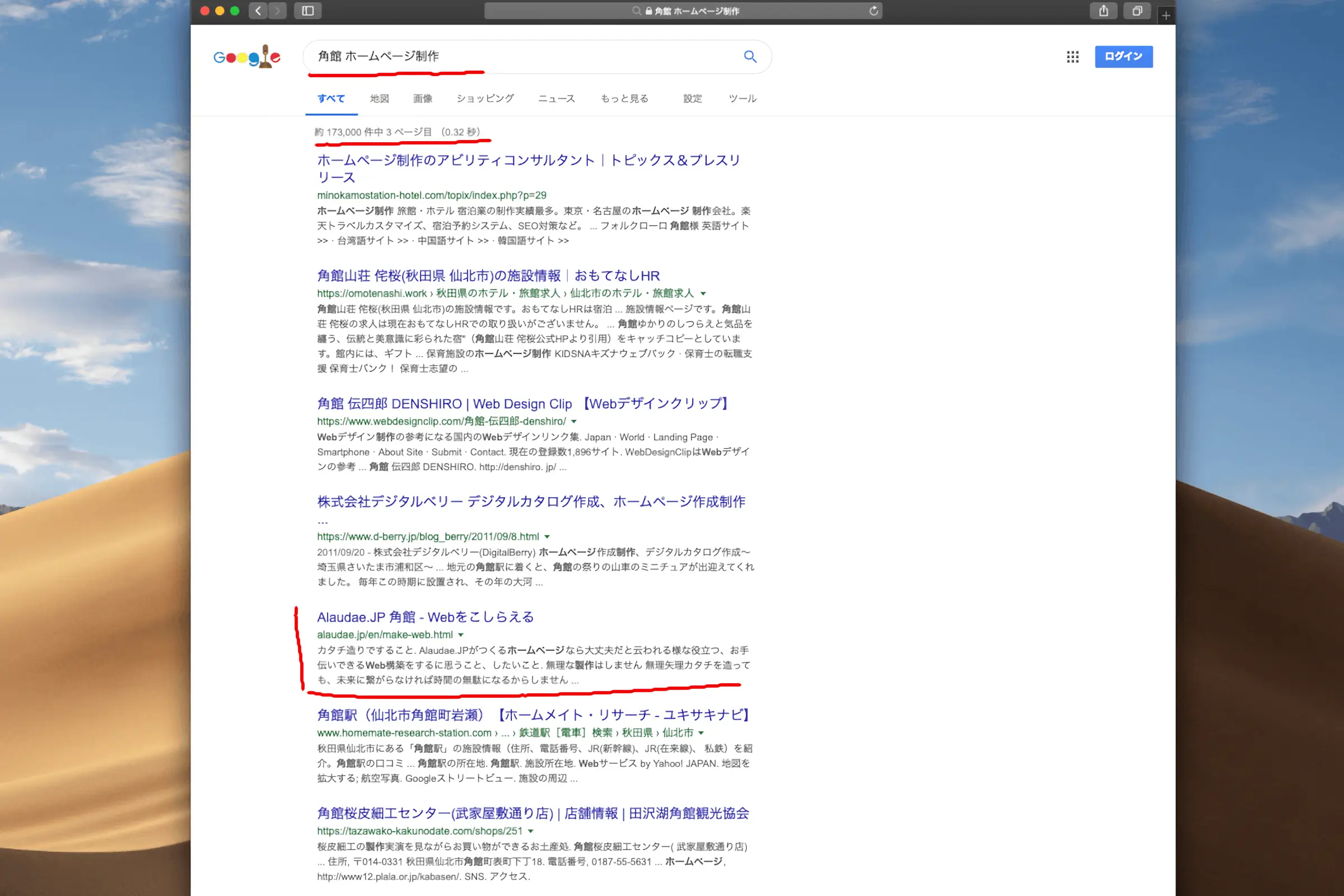 Proto jsme se při této obnově webu Alaudae.JP zaměřili na jednoduchá SEO opatření, která se zaměřila na klíčová slova 'Kakunodate, web, tvorba, výroba homepage', což se projevilo na zobrazení webu na první stránce.